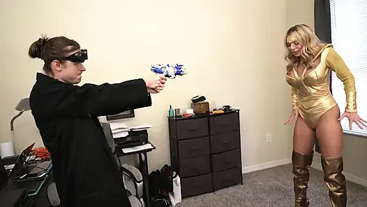 Gold Valkyrie discovers Dr. Nitro's private lab from a strange energy signature. Gold Valkyrie plans to apprehend her arch nemesis and end his evil plans. However, Dr. Nitro is prepared for the golden superheroine with his ultimate weapon completed. He plans to corrupt Gold Valkyrie to become his personal and super slut. Dr Nitro ends the fight scene before it even gets started with his arousal laser. Gold Valkyrie becomes super horny and rubs her tits and is ready to do whatever for him. He makes out with her and licks her tits before having her suck his dick. He then fucks her tits for a bit and returns his cock to her mouth. He then lays her on the bed and fucks her in several different positions before cumming all over her face. Later that day she admits she can't even think about fighting crime anymore and only wants to be with Dr. Nitro.